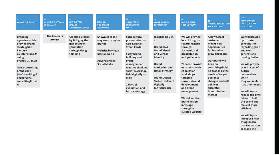 The 17 steps for effective branding from “ZAG” by Marty Neumeier, was used to develop our concept branding.